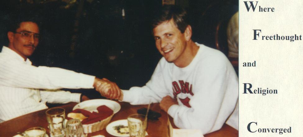 As I pondered, my eyes drifted to a portrait of my mother, who throughout my life’s most formative stages exhibited the finest display of courage a child could ever hope to witness. That is another story for another place. They drifted on to my living room’s "wedding corner" wall of memorabilia representing my first true experience of commitment. My eyes then drifted above my personal computer where hangs another special possession: a picture of me shaking hands with Pat Swindall. My wife, Vickie, took the photo after a lunch to which Pat invited us. He extended the invitation after receiving a letter from me commending him on his show. Though Pat is a high-profile individual, he saw fit to reach out to me simply because I rejected Christ but respected him. He drove halfway across our metropolis to meet with me. I had nothing to offer him. I possessed no political clout, or wealth. He did not convince me of a God’s existence; however, he demonstrated true Christian outreach. To this picture I inserted a caption, "Where Freethought and Religion Converged" (a twist on Pat’s radio slogan "Where Politics and Religion Converge"). I inserted this caption because I had a visceral feeling Pat and I would know each other in an unusual way for many years. Despite our disparate theological perspectives, I enjoyed an affinity with him that eluded my relationships with most "freethinkers."